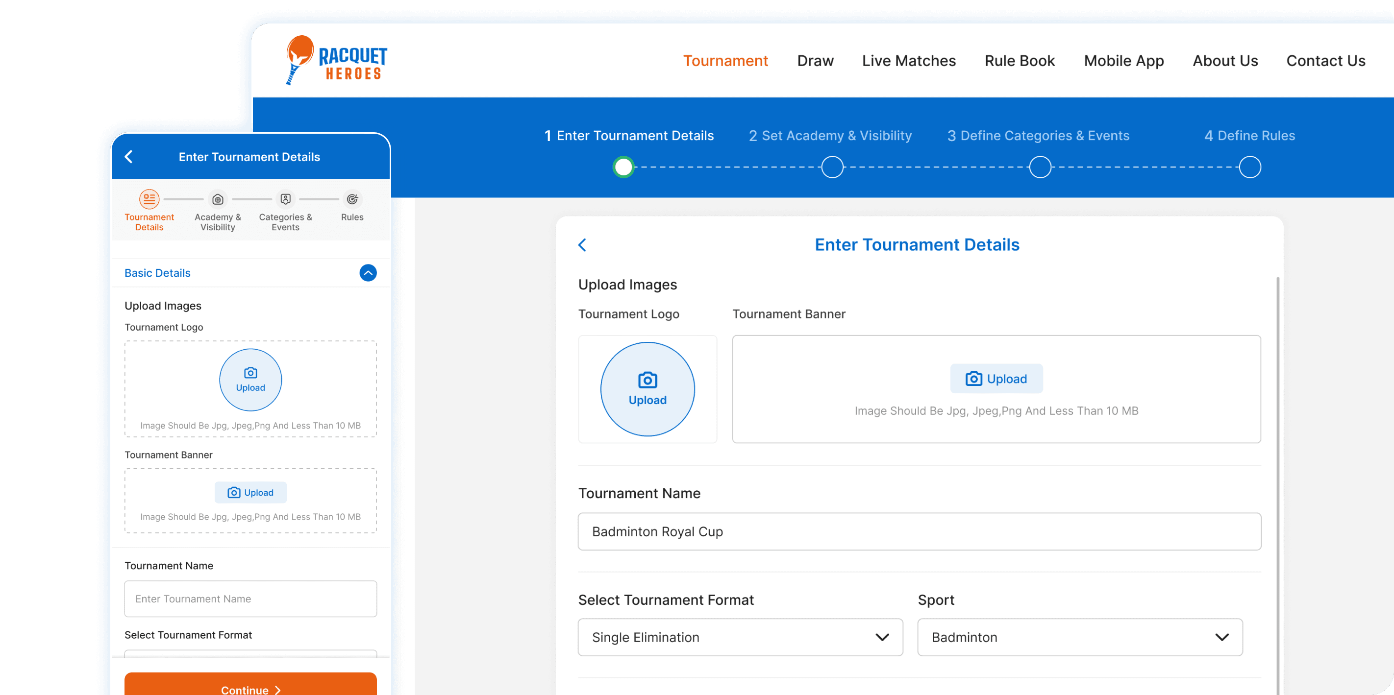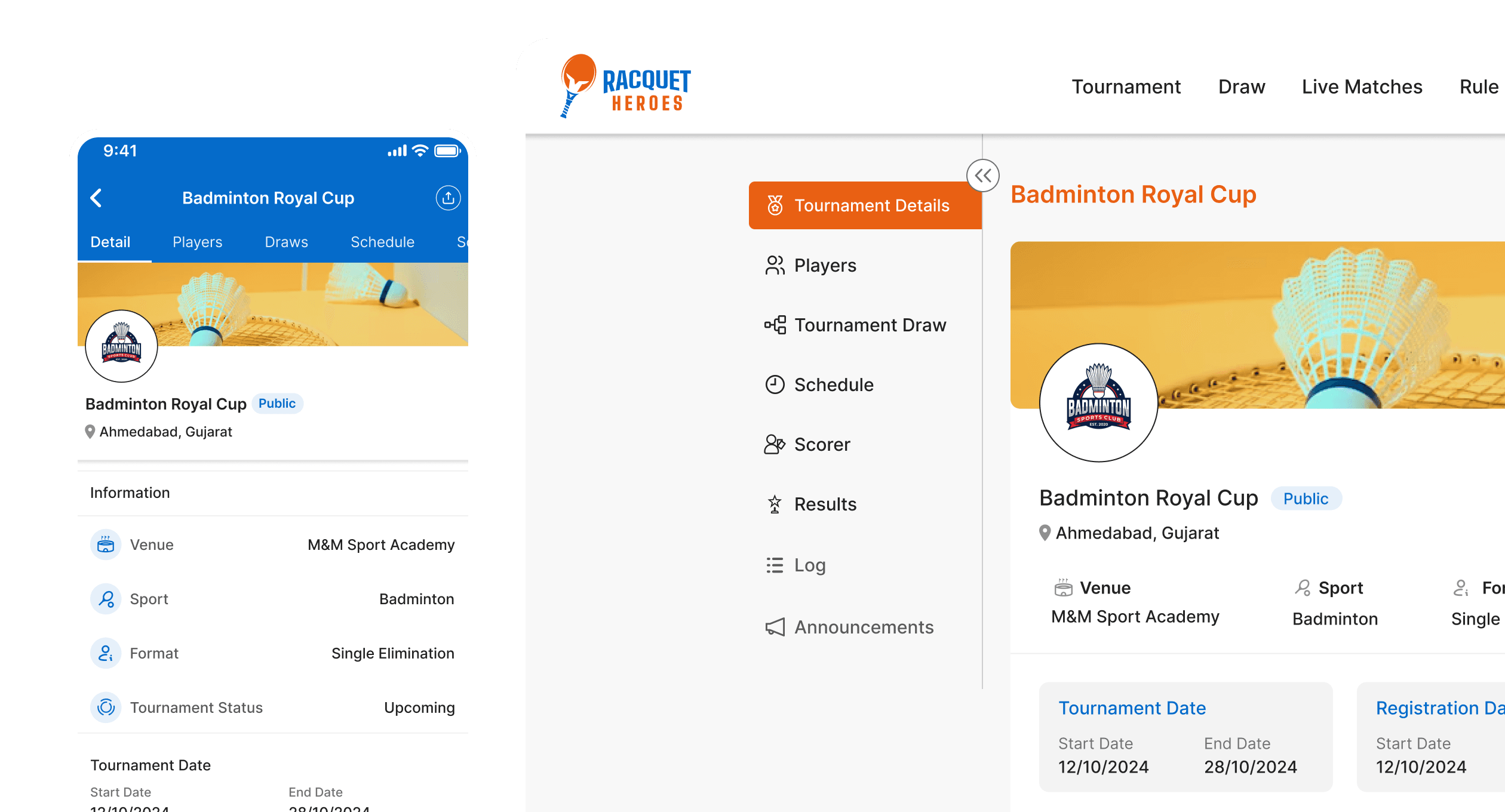 Create your tournament exactly the way you want give it a name, pick your sport, define categories, set the rules, and choose the format. With Racquet Heroes,everything goes live instantly, allowing players to join, share, and hit the court ready to compete.
