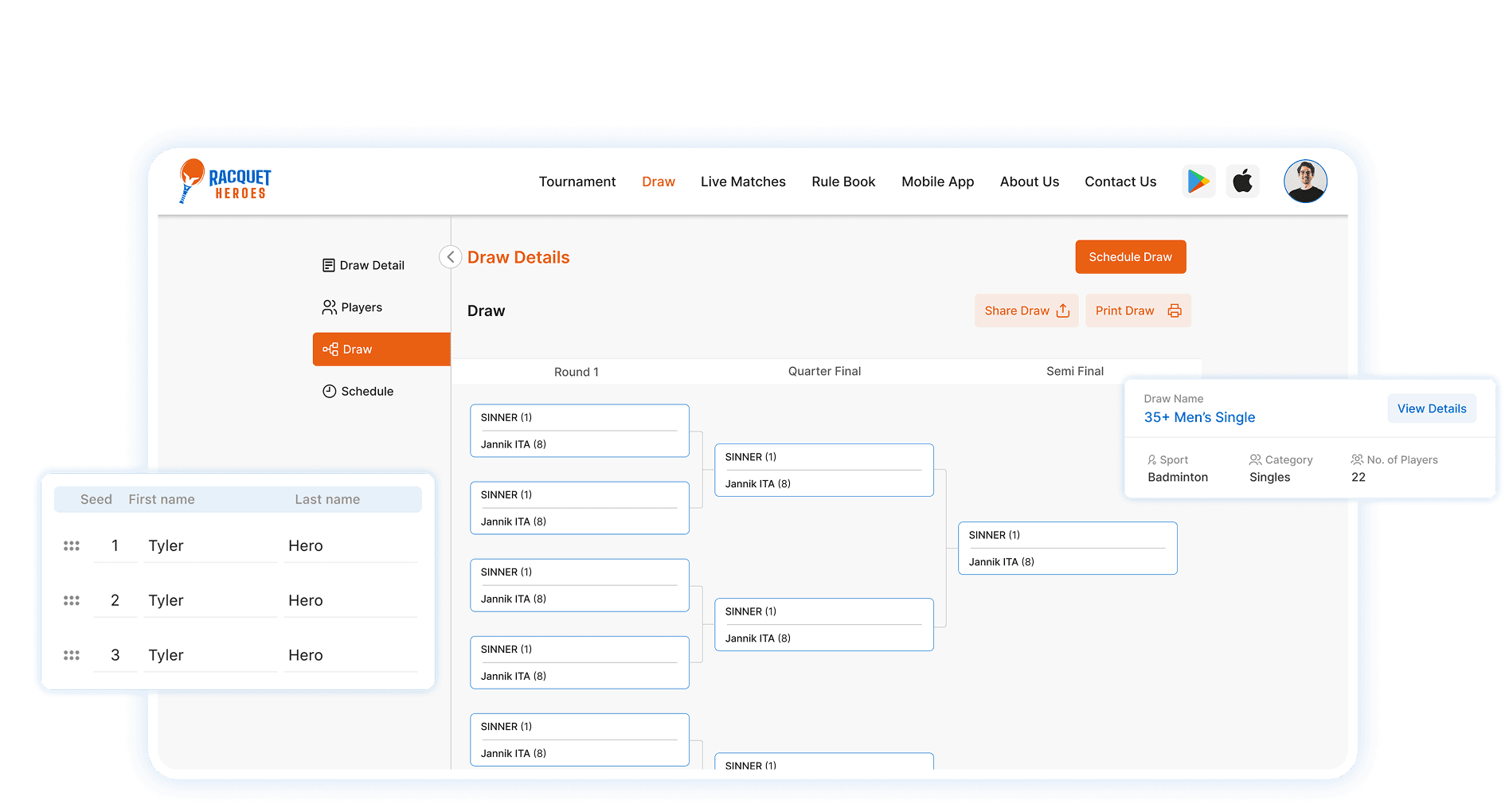 Create a custom draw in minutes simply choose the draw name, player count, sport, and format, and create a setup perfectly suited for any racquet sport.