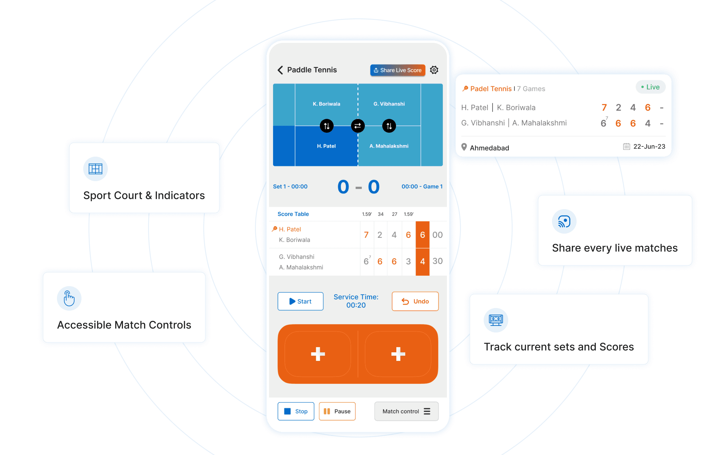 Score every point live, access match statistics instantly, and share scores effortlessly with your community.