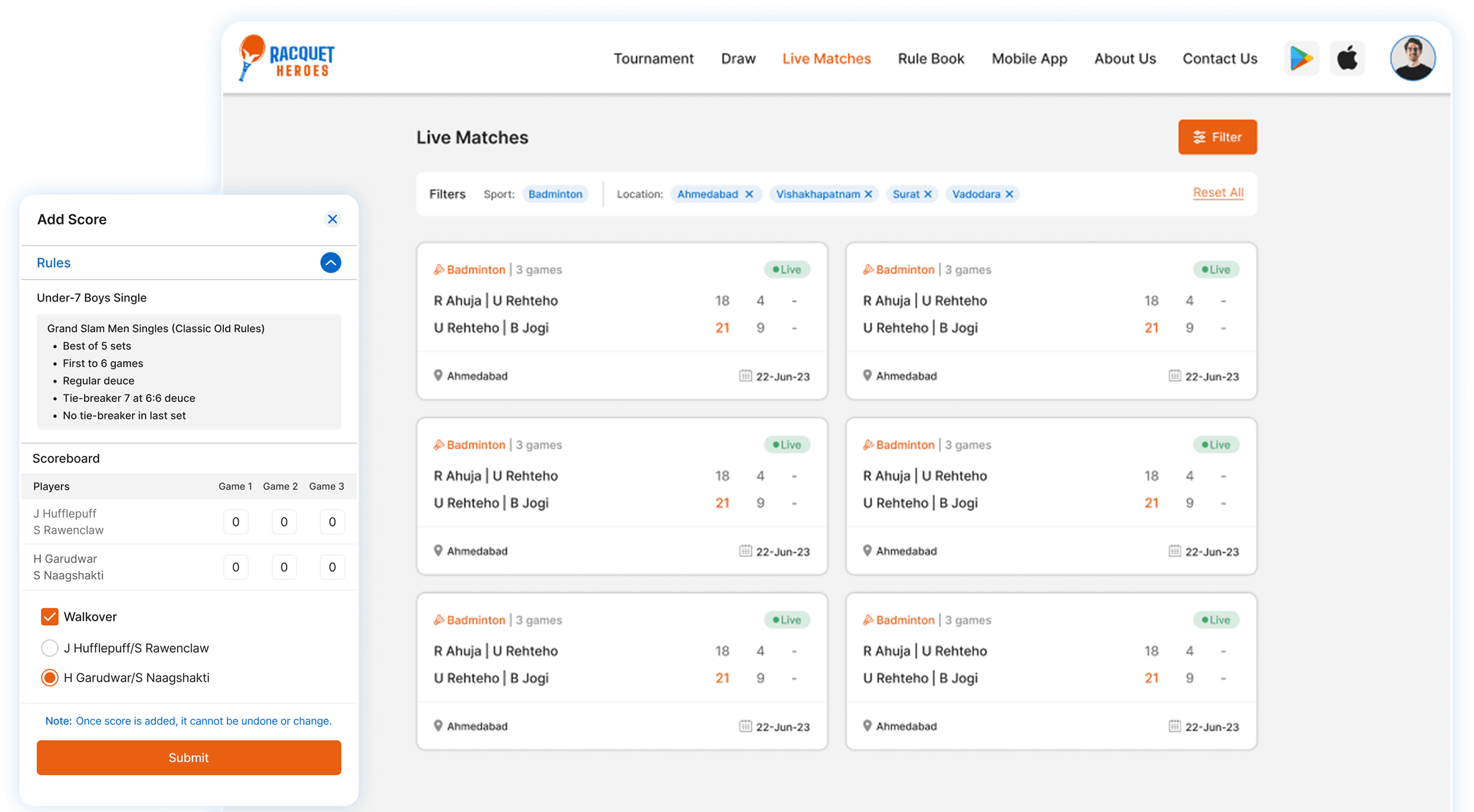 Racquet Heroes offers an all-in-one solution for tournament discovery, registration, scoring, and performance tracking making the entire experience seamless for players and organizers.