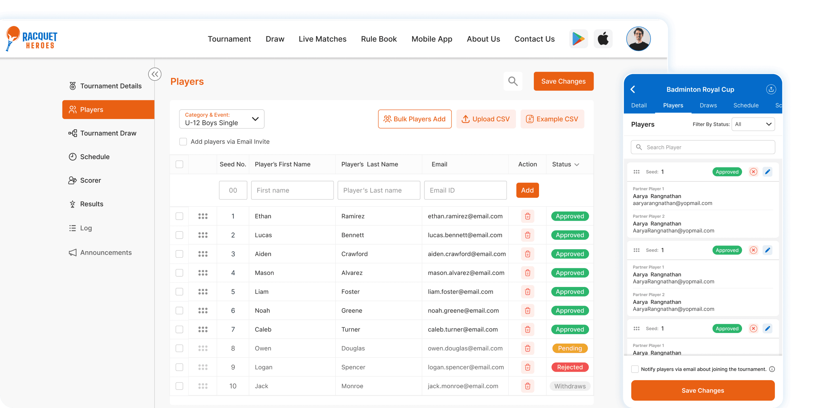 Add or remove players, upload entries in bulk, and assign seedings with ease. Every update reflects instantly keeping your draw accurate, live, and fair for all participants.