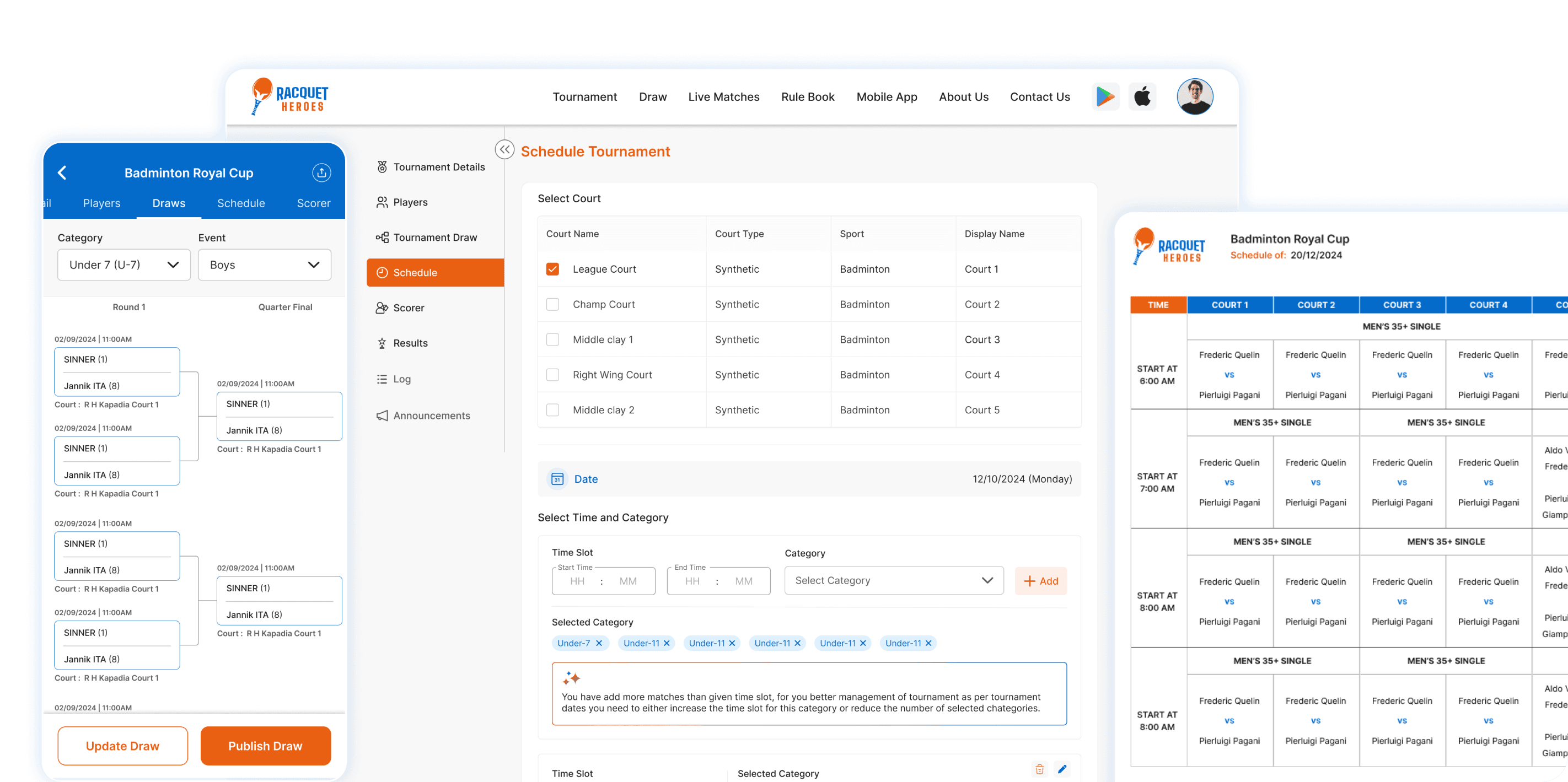 Set match dates, assign courts, and define game timings with ease. Racquet Heroes automatically builds your complete event timeline so you can focus on running a seamless tournament.