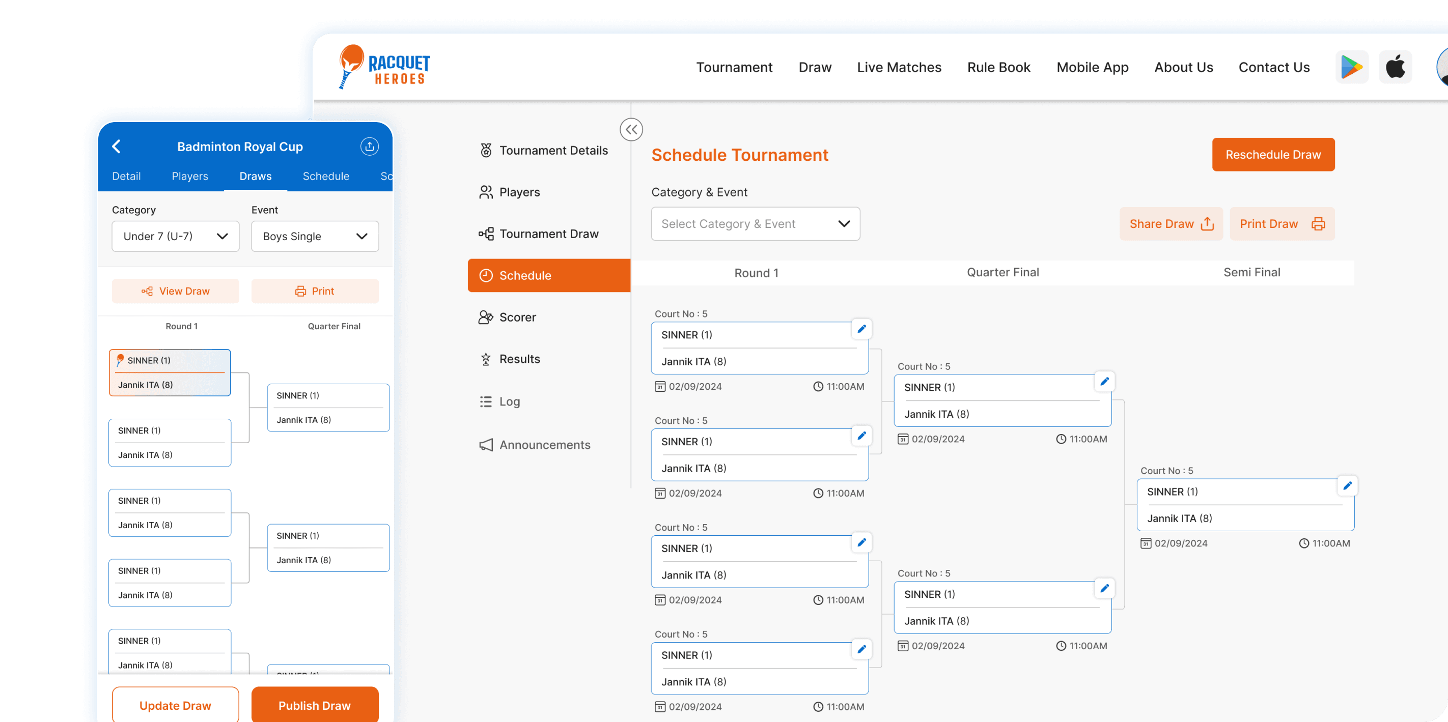 Effortlessly Manage your Live matches, Scorings, Statistics, Tournaments and Custom Draws.